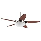 A perfect balance of rich leather, brushed metal and furniture-grade wood, Sojurn defines contemporary. With its unique blend of the casual and the sophisticated, this is a fan that belongs in every modern home - and the Museum of Modern Art. Two - position mounting Uses three 40-Watt candelabra bulbs Remote control included Comes with 5 dark cherry and dark walnut blades